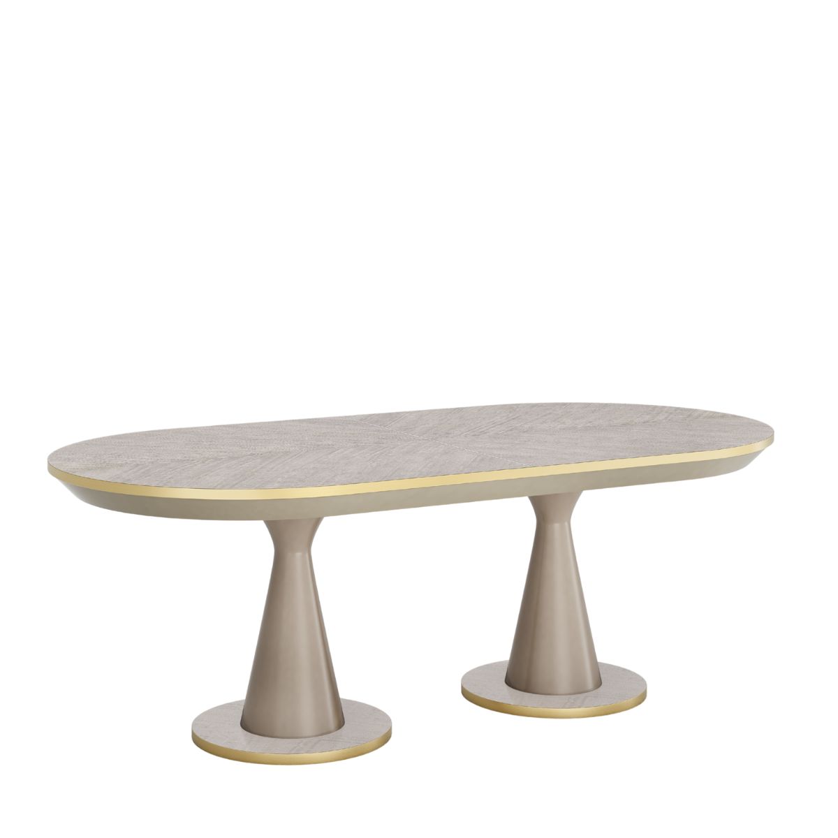 The 6003 FRIDA is an oval table featuring a veneered top in natural eucalyptus and lacquered bases in sand or ice finishes. Gold leaf decorations add a touch of luxury to your decor. Contemporary design and customization options characterize this table. Discover the other furniture pieces in the CLIZIA collection for a complete, refined, and elegant interior. For an even more modern touch, we invite you to explore our 6004 table and the 6005 console.