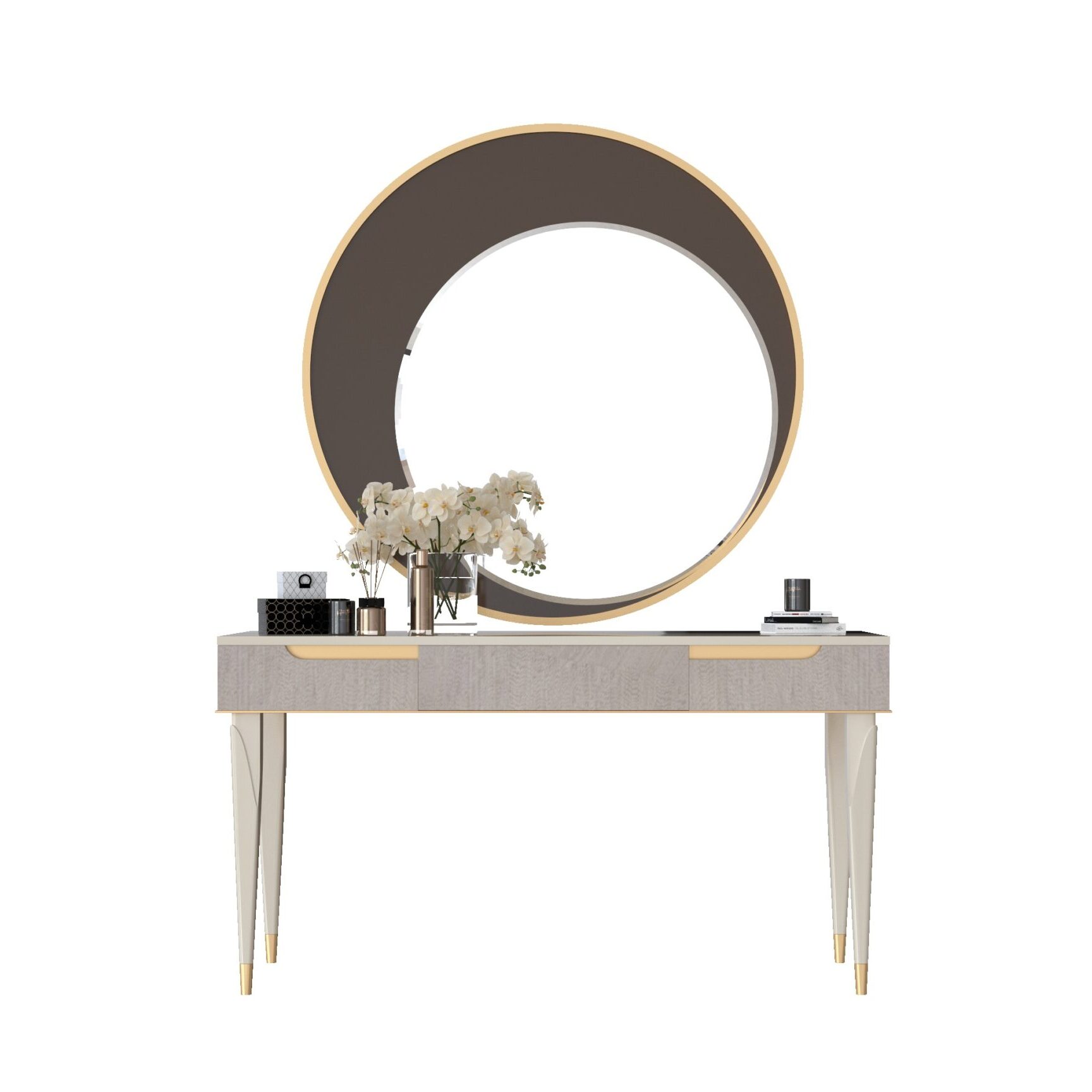 The 6005 CLIZIA is a console with three drawers veneered in natural eucalyptus. The legs are lacquered in sand or ice with gold leaf decorations. The brass handles add a touch of luxury to your decor. Its contemporary design and customization options characterize this console. Explore other furniture pieces from the CLIZIA collection for a complete, refined, and elegant decor. For an even more modern touch, we invite you to check out our table 6003 and TV stand 6039.