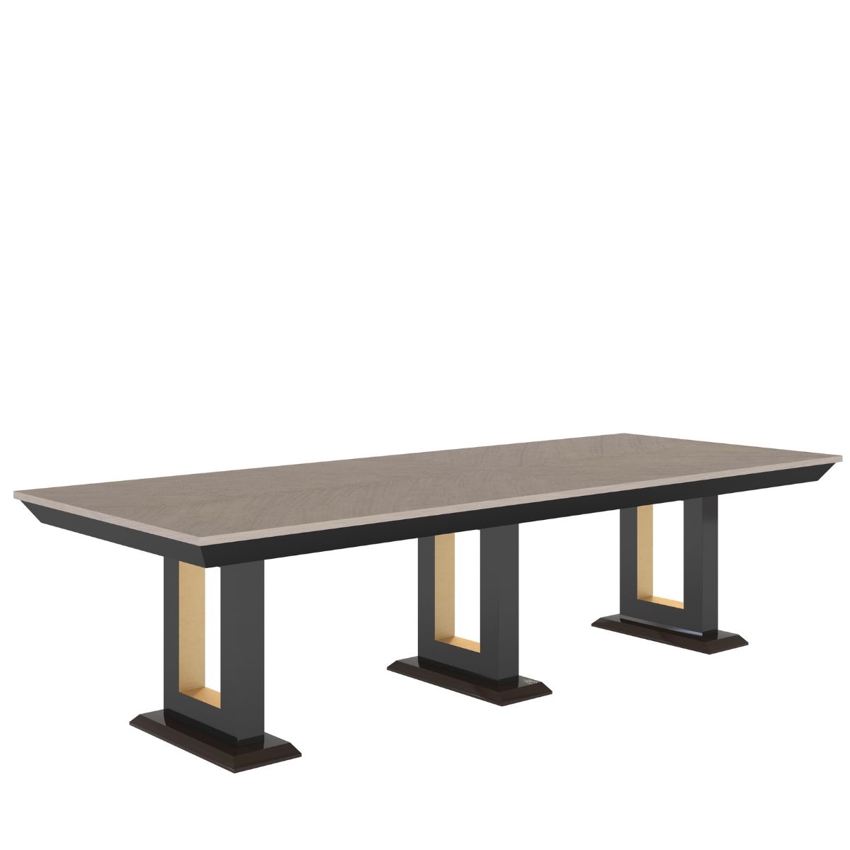 The GIANNI 7102 table is a rectangular dining table with a top veneered in natural eucalyptus and three deep coffee lacquered bases with gold leaf details. This piece represents the perfect balance between elegance and comfort. To complete your décor, also explore our IVES and OSCAR 3003 tables.