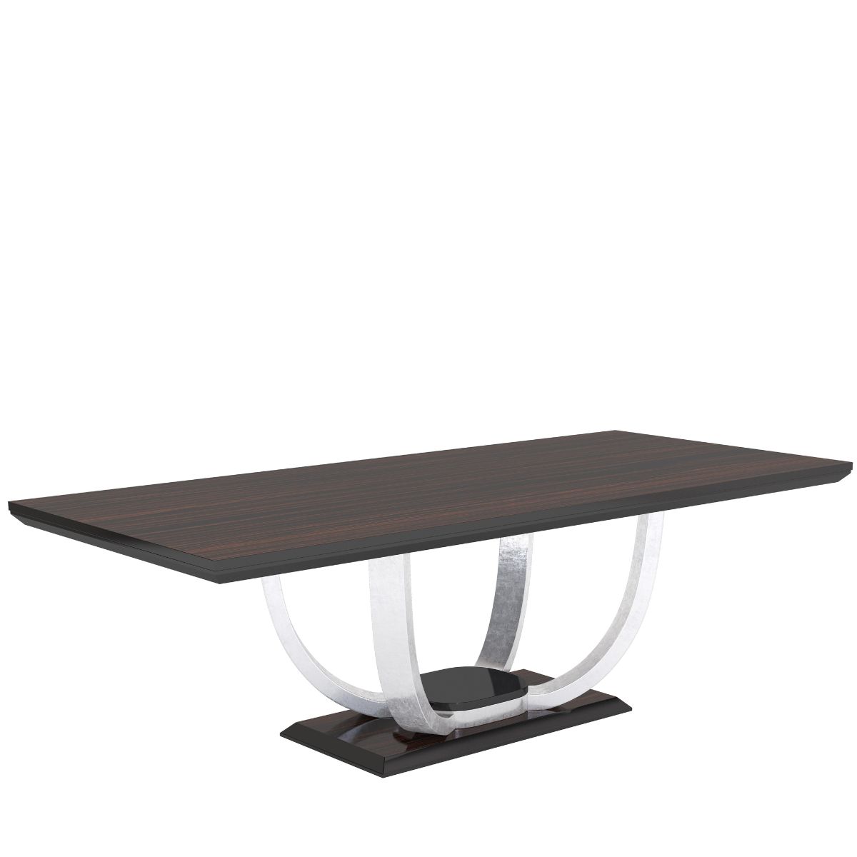 The 7104 CALVIN is a rectangular table with a pedestal base. The top and pedestal are veneered in ebony and lacquered in black. The base features silver leaf details that add a touch of luxury to your decor. Contemporary design and customization options characterize this table. Discover other pieces from the ICONIC collection for a complete, refined, and elegant interior. For an even more modern touch, we invite you to explore our mirror 7236 PANAREA and coffee table 7231 TROPEA.