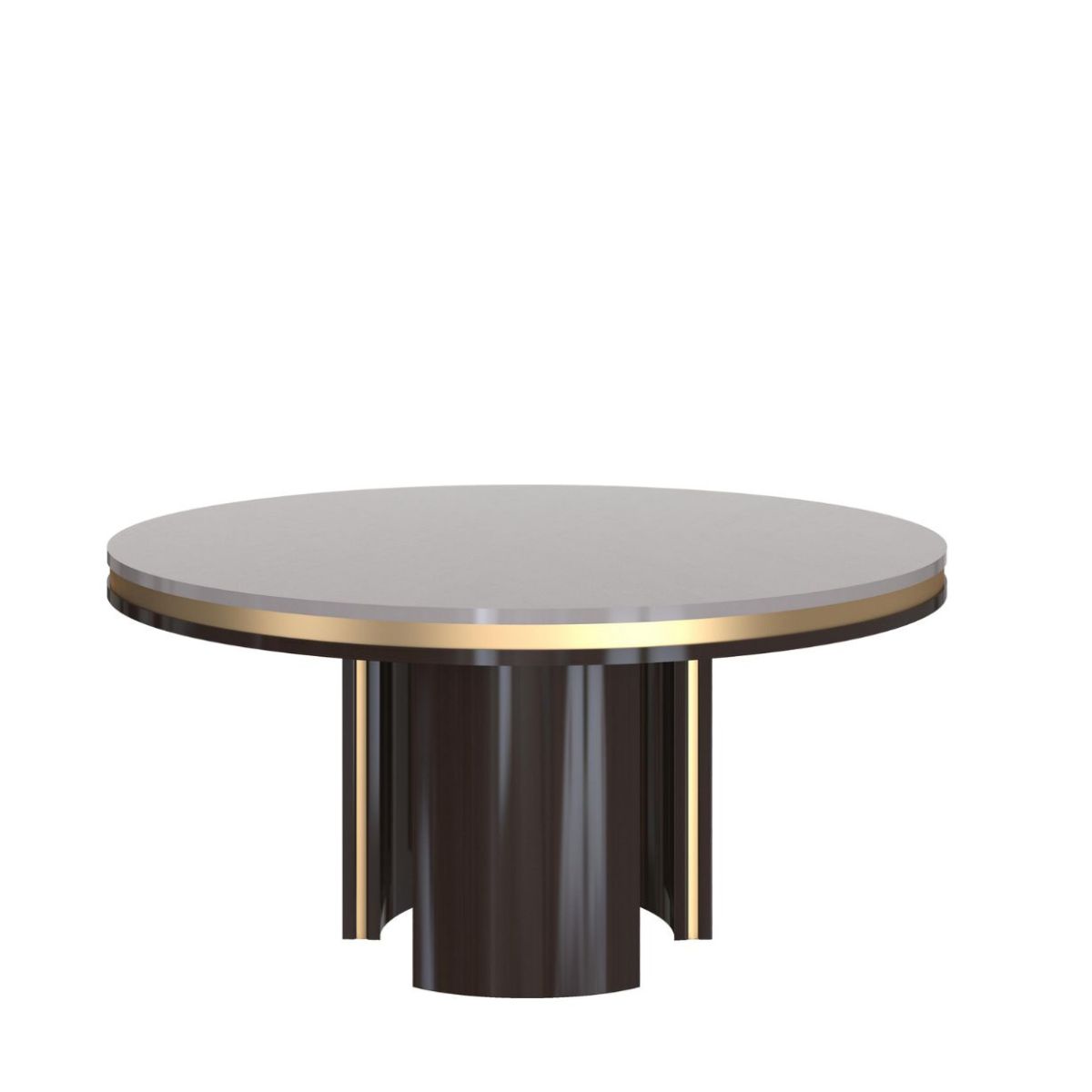 Tavolo rotondo impiallacciato in eucalipto con base laccata Chocolate. Dettagli foglia oro.