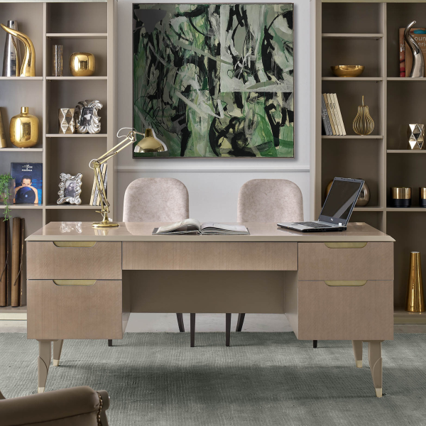 Dear Future è la linea avanguardista di STUDIO PRIVÈ, con pezzi come la scrivania DF8400 in eucalipto Taupe e foglia champagne. Tecnologie innovative si fondono con design Made in Italy.