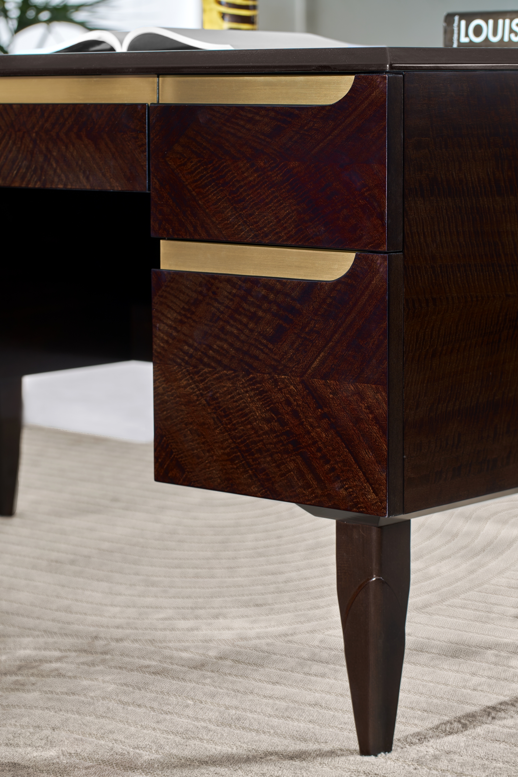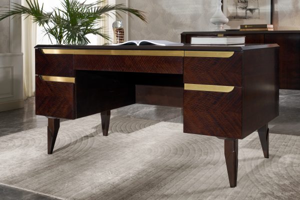 La GW8200 rappresenta l’essenza di THE GENTLE WORKSPACE, dove il comfort domestico incontra l’eleganza professionale. I suoi 5 ampi cassetti a tutta estensione e la superficie spaziosa offrono un’organizzazione impeccabile, mentre la finitura in Dark Eucalyptus e i dettagli in ottone satinato aggiungono un tocco di raffinatezza contemporanea.